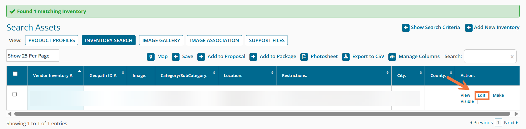Now that your support files are in the system, you can associate them to the related assets. To do so, navigate back to your inventory by clicking 'Inventory Search'. Find your inventory again that you want to update and click 'Edit'.