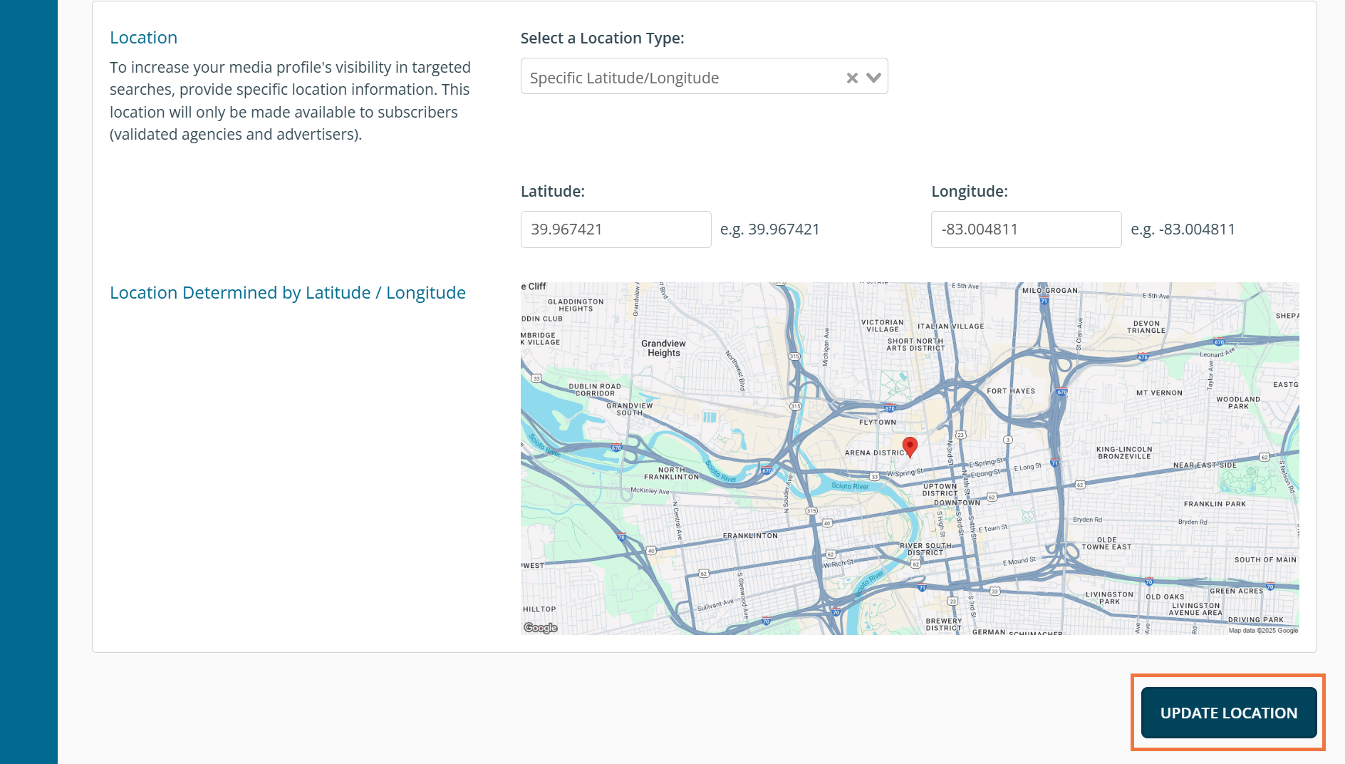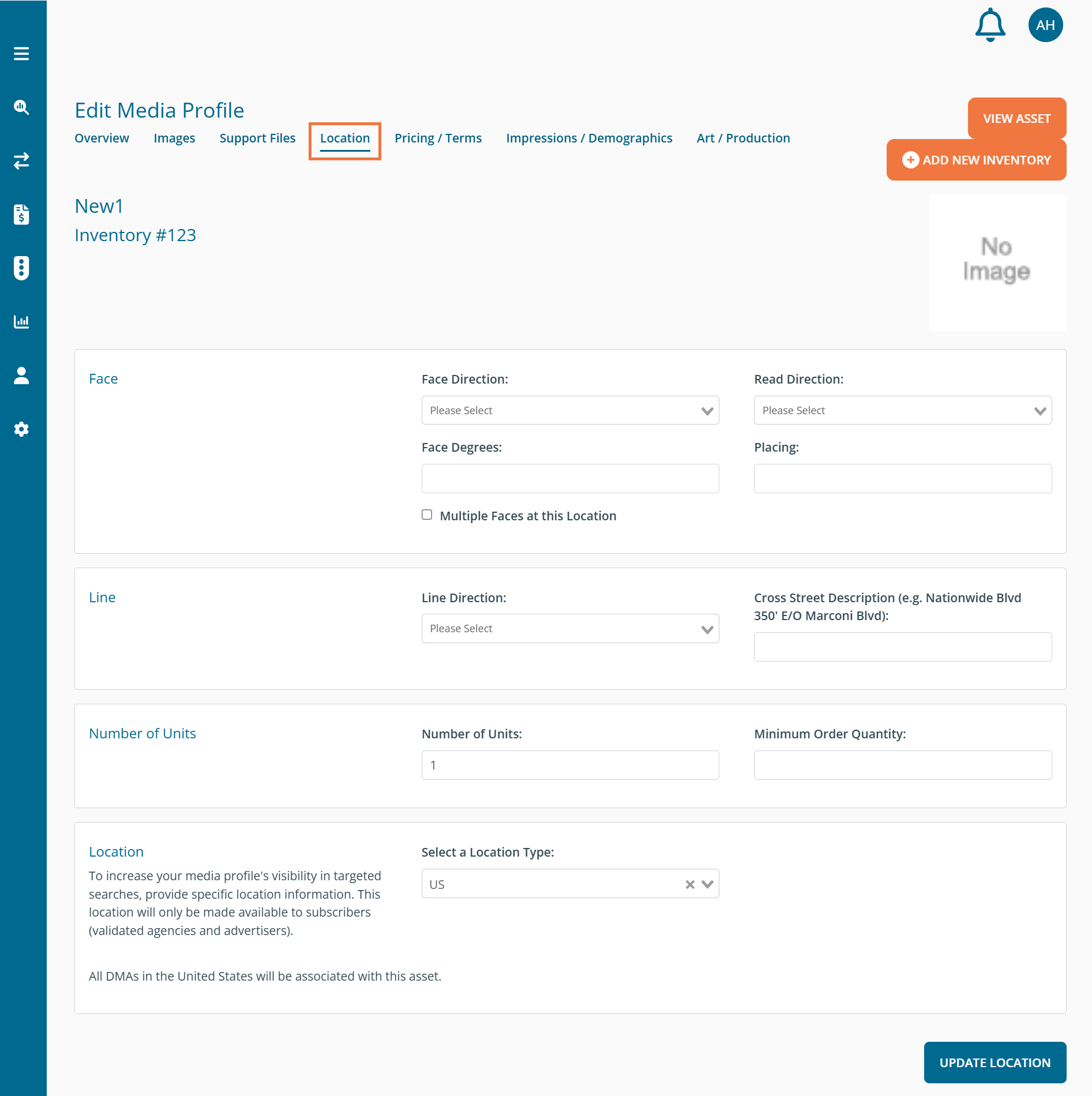You can enter additional information related to the location of the asset, such as: -Face Direction indicates the direction that the creative will face. Ex. A billboard could have two faces of North and South. -Therefore, for the above example, the seller may want to select the box for Multiple Faces at This Location depending on how they structure their assets. -Read Direction indicates the line of sight or the direction that the viewer would need to be facing in order to see the creative. -Line Direction indicates the direction in which travelers would see the asset. -Total Units Available -Minimum Order Quantity -Location Type: Enter a Specific Latitude/Longitude, Specific Street Address, Set of Zip Codes, Set of Metropolitan Statistical Areas (MSA), Set of Market Areas, Set of U.S. States, The Entire United States, Country other than USA, or The Whole World. Be sure to click the 'Update Location' button at the bottom of the page to save your changes.