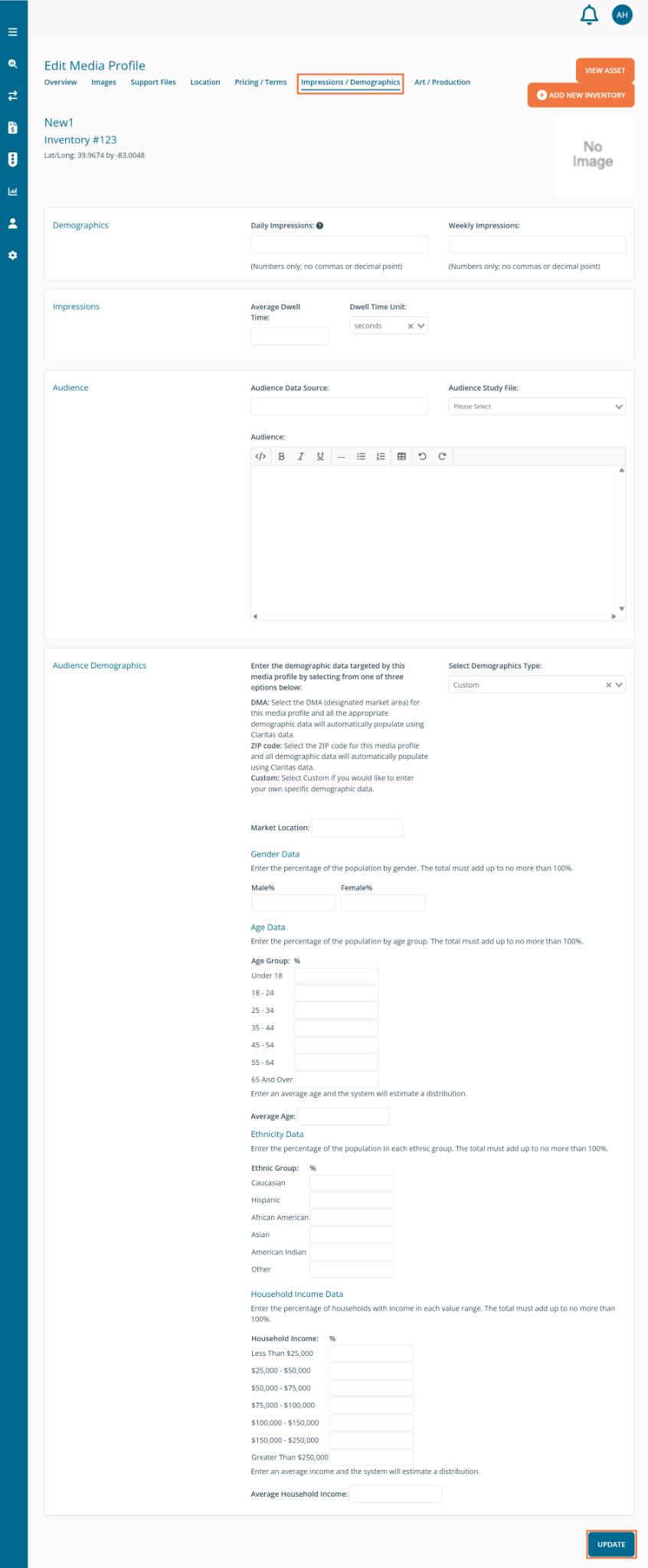 The Impressions / Demographics tab allows you to enter the number of impressions for that specific asset. You can also select demographics data on this page by selecting one of four options: National Average, Market Area, Zip Code, or Custom.