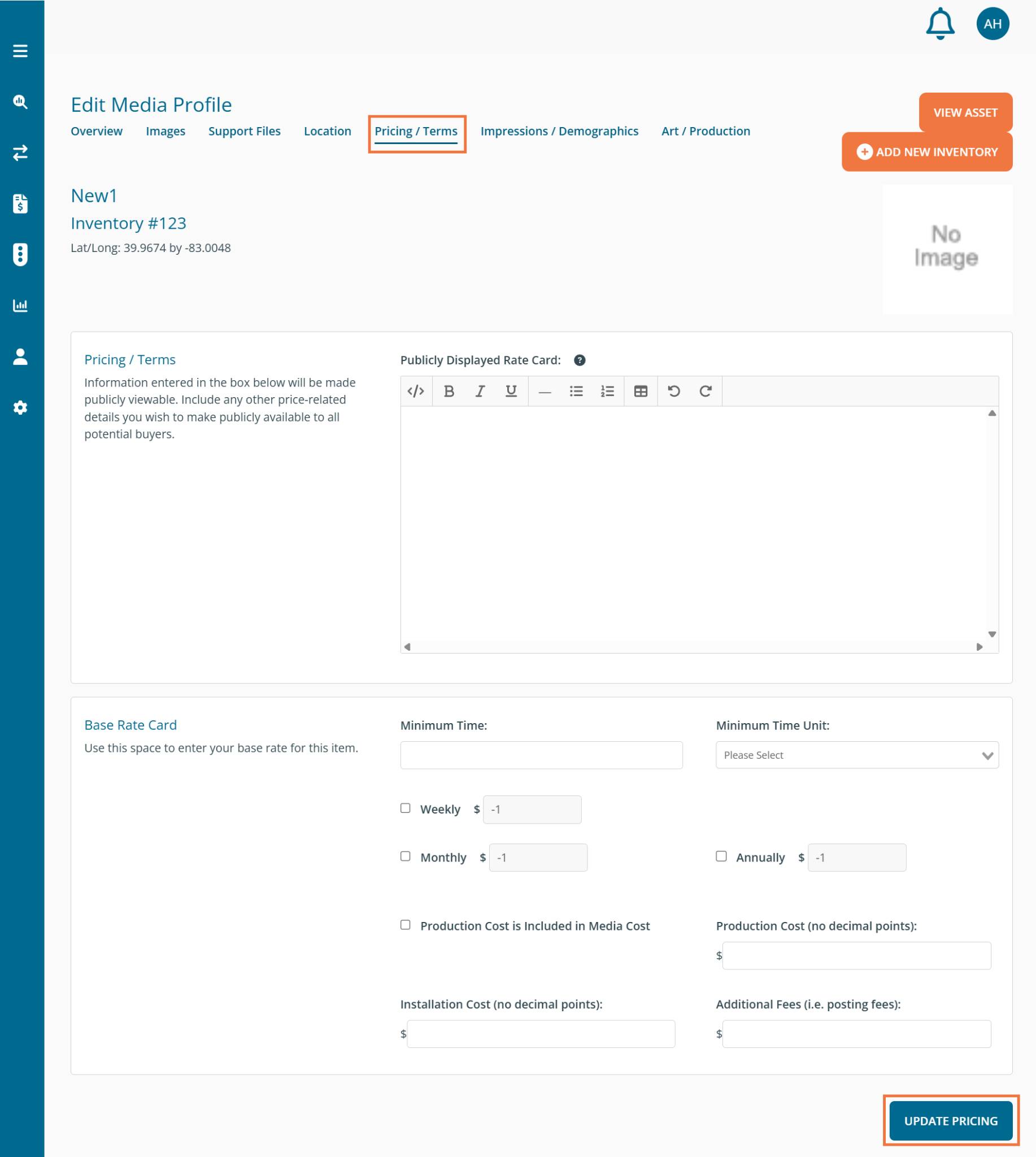 From the Pricing / Terms tab, you have the ability to add information regarding rate card data. Ex. Unit Quantity: 4 (minimum), Frequency: 1 - 12, Cost per Unit per Month: $1,000, Production Costs: $6,000.