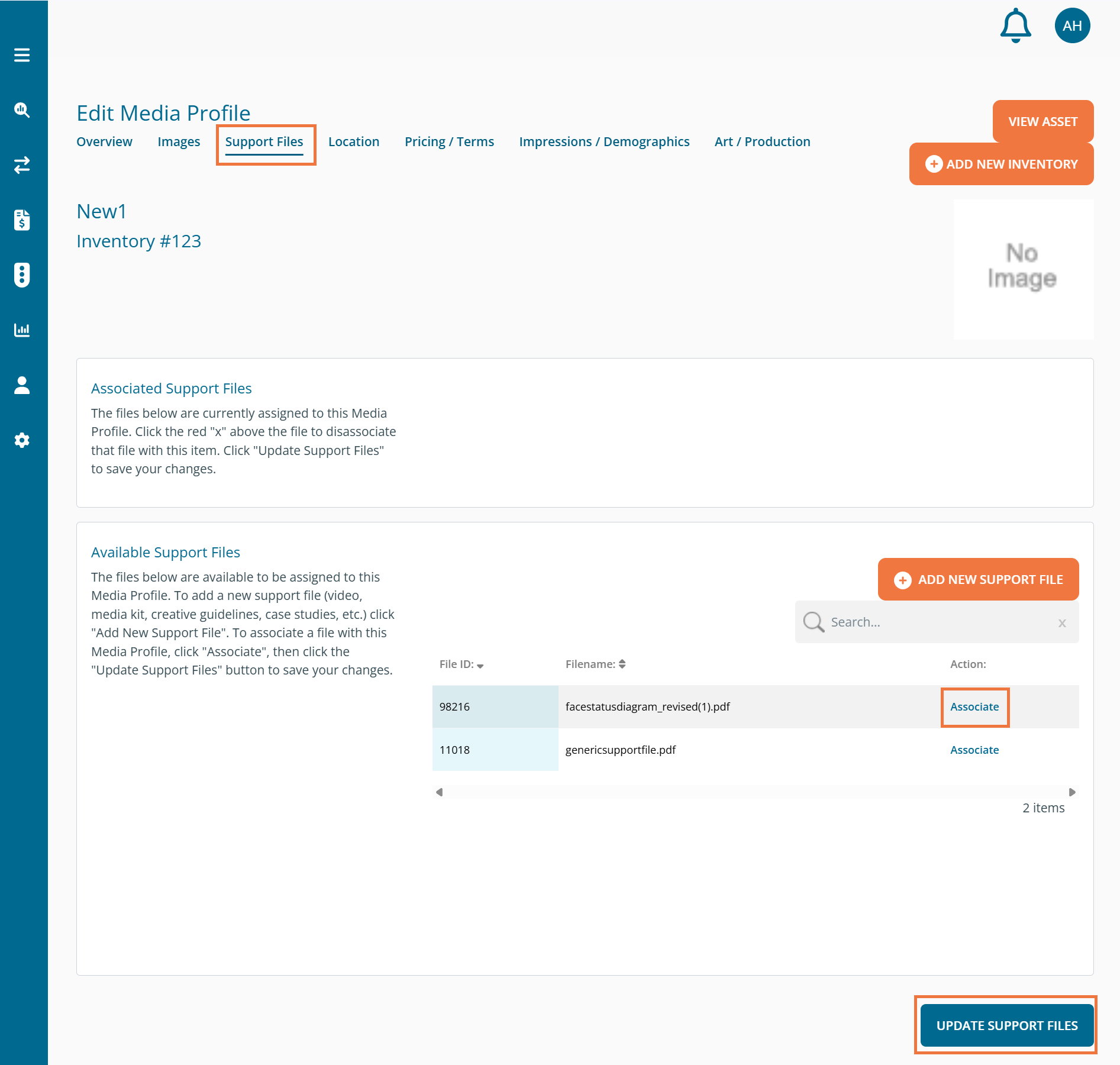 Scroll down until you see the support file that is related to that piece of inventory, click the 'Associate' button. The associated file will move to the Associated Support Files section. Scroll to the bottom and click 'Update Support Files' to associate that file with the asset.