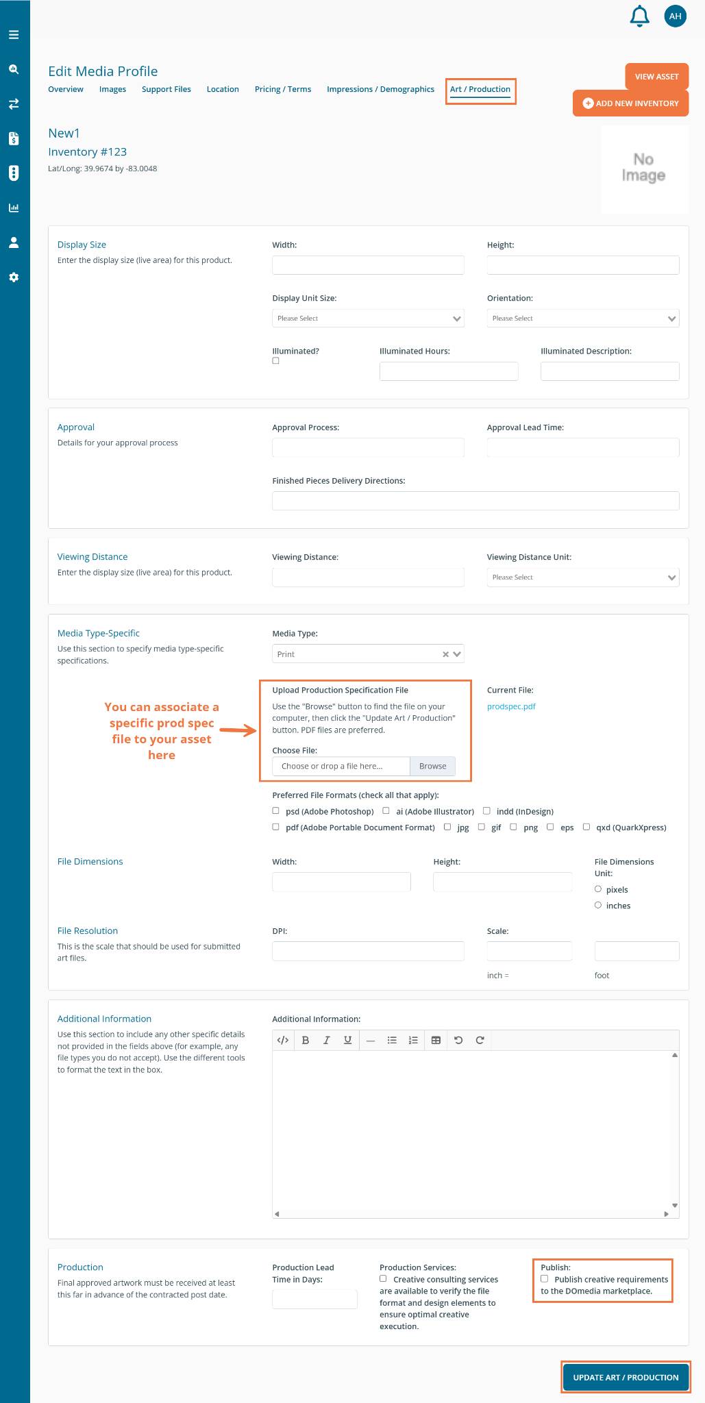 The Art / Production tab allows users to enter information regarding Width / Height, Approval Lead Process, Media Type, etc.
