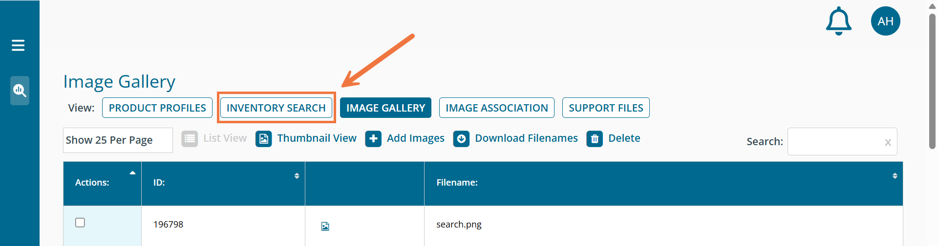 Now that your images are in the Image Gallery, you can associate them to the related assets one by one using this method. To do so, navigate back to your inventory by clicking 'Inventory Search'.