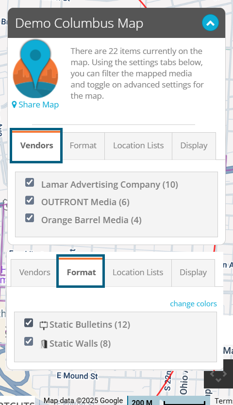 Is the related vendor or format for that unit selected to be displayed on the map? Note: Both Vendors and Formats can be deselected within a map. Double-check your selections in the Vendors and Format tabs by expanding out the panel in the upper right corner of the map.