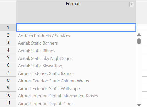 The grid also features autocomplete in the below cells. As you begin to type, DOmedia offers suggestions to help save time and create standards for the industry. Vendor Format Market Cycle Type