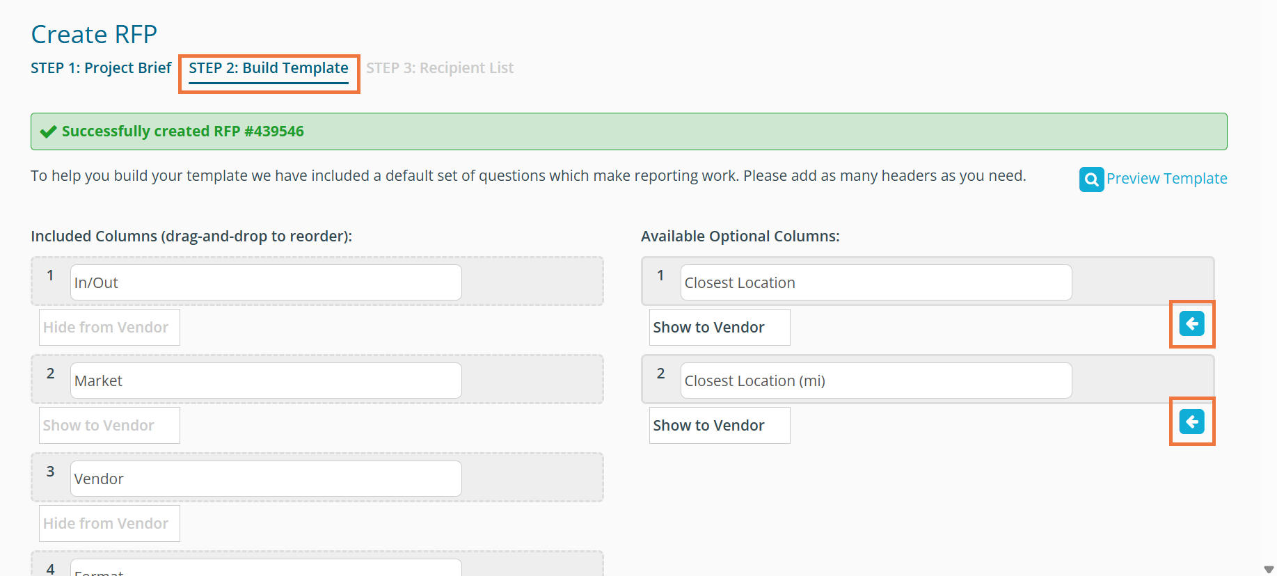 Once you complete step 1 of creating an RFP, you can add a "Closest Location" column in step 2. Under "Available Optional Columns," click the arrow associated with 'Closest Location' to move it to the included columns section. You can also add 'Closest Location (mi)', which shows the closest location in miles.