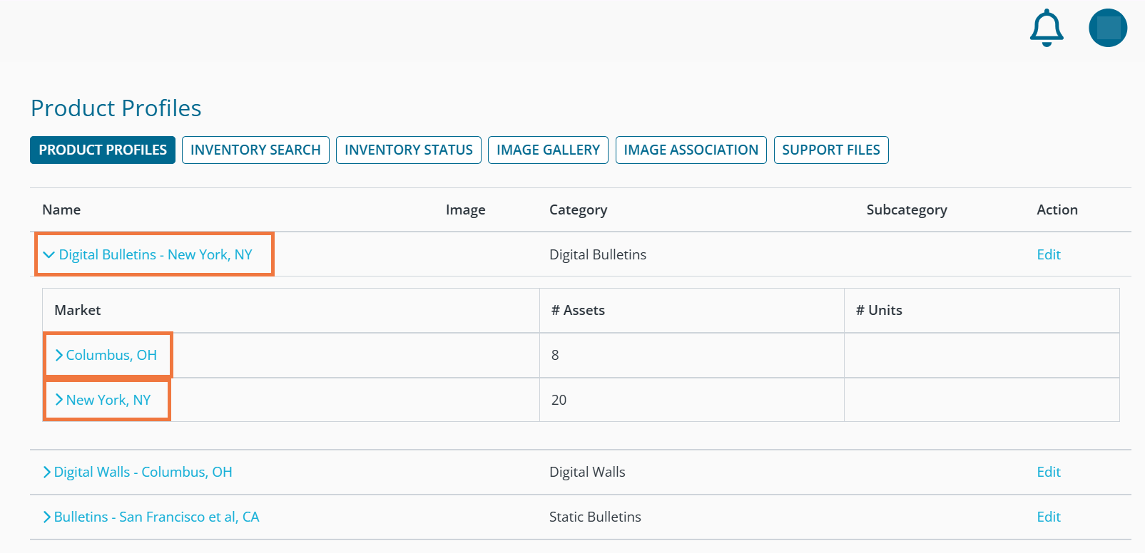 Product profiles are a way DOmedia groups your inventory when displaying on your company profile. They are automatically created when inventory is added to your account, and they are a grouping of category/market (and potentially a subcategory as well, if applicable). For example, if your inventory includes Digital Bulletins in the Columbus, OH DMA and the New York, NY DMA, the system will create a product profile for each combination of category and market: