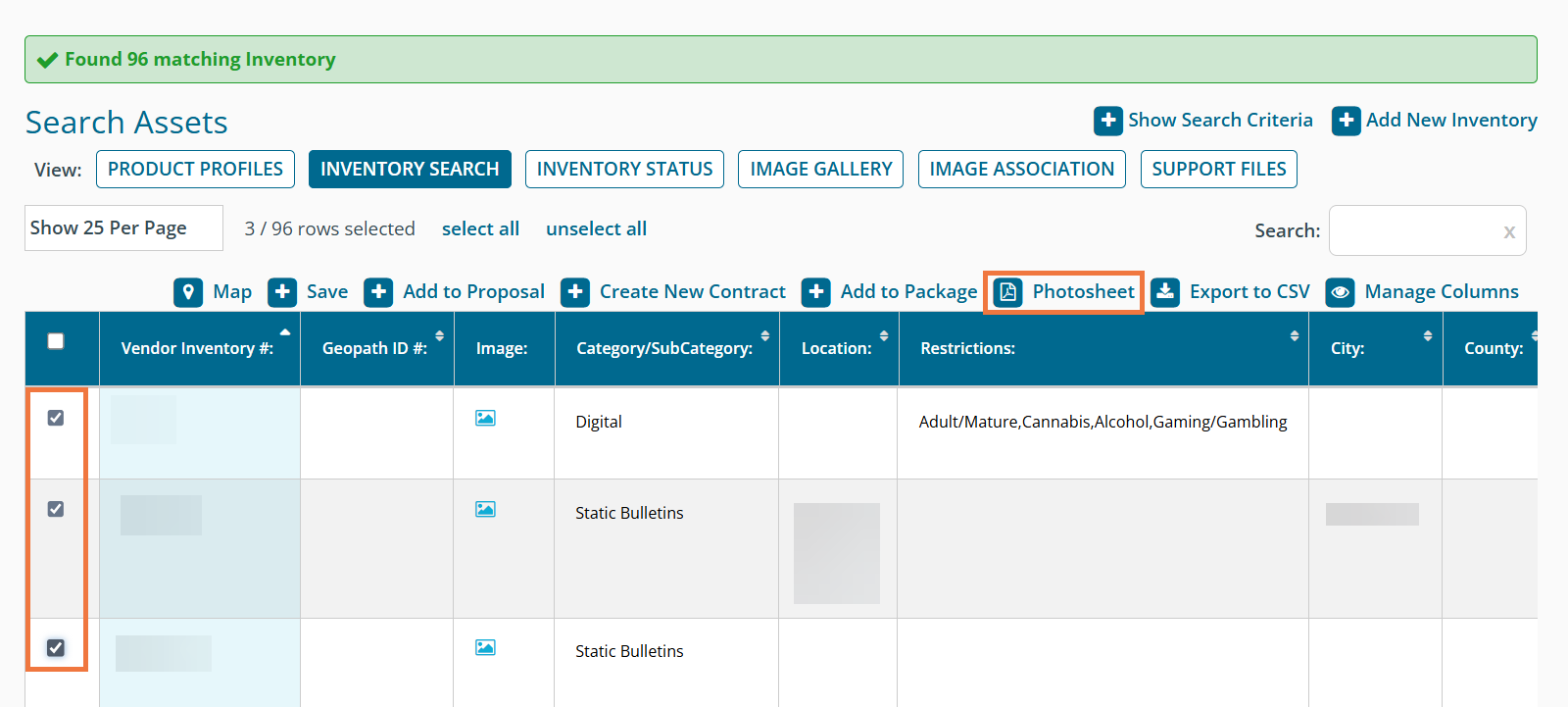 In the results, click the checkboxes next to the assets you would like to create the photosheet(s) for, then click the "photosheet" button above the results:
