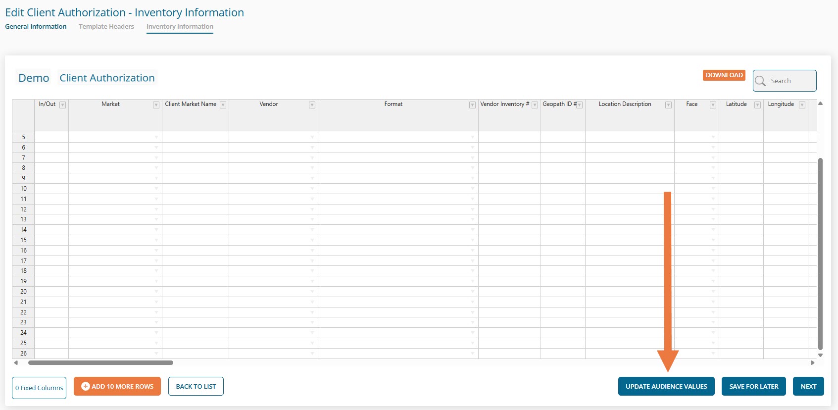 3. On the Inventory Information section of Client Authorizations, the Update Audience Values button: