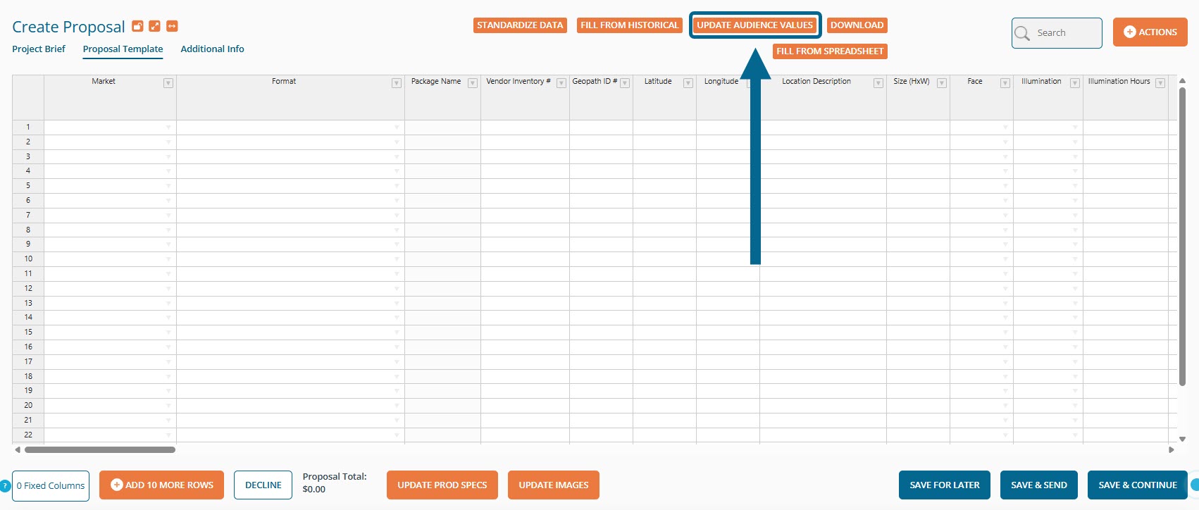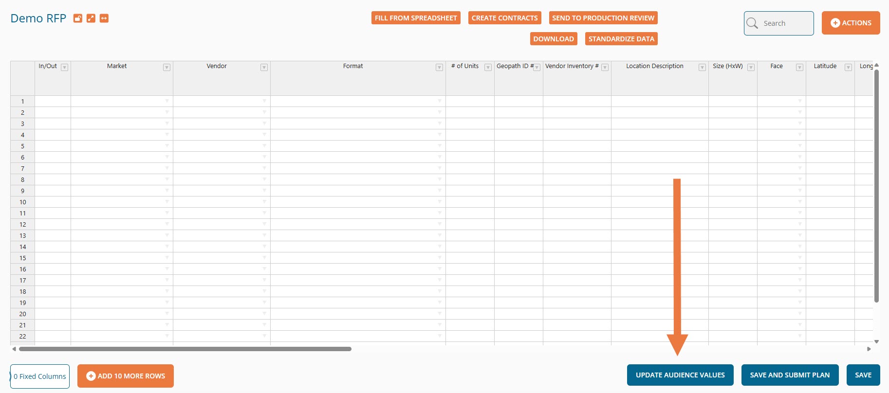 If your RFP was created previously, before the 2025 dataset became available in DOmedia, then your RFP will still contain values from 2024. For an RFP to pull Geopath 2025, you would need to click "Update Audience Values" to override the 2024 data with 2025 data, or use Geopath Site Specific Planning to pull 2025 measures for the Geopath IDs in the RFP.