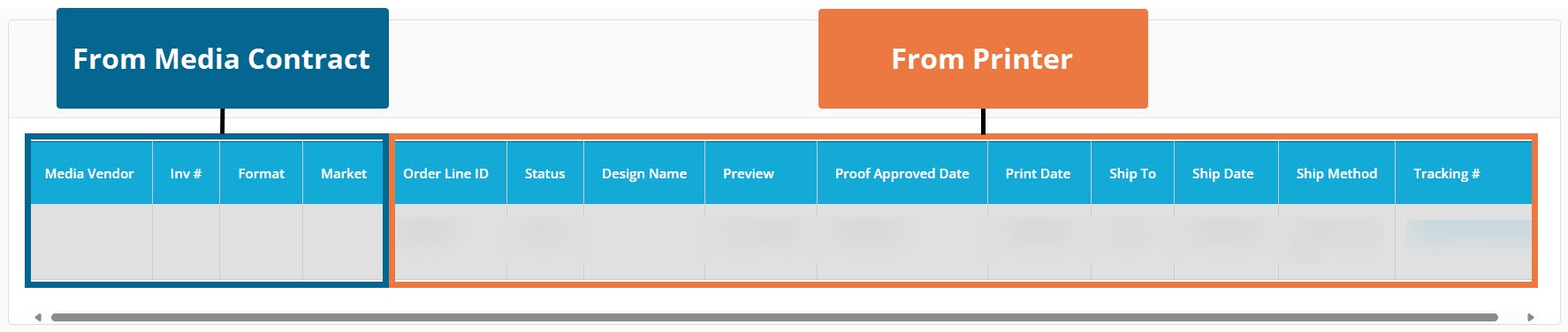 The first 4 columns are filled out automatically when we find a media contract in the campaign to link to the printer order. The remaining columns pull from print partners, with the Ship Date and Tracking # to populate once it is sent from the printer.