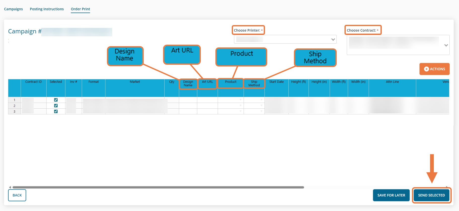 Select the desired Printer, Contract, and Rows, and enter the required information including Design Name, Art URL, Product, and Ship Method. Once you've filled in all necessary details, click "Send Selected."