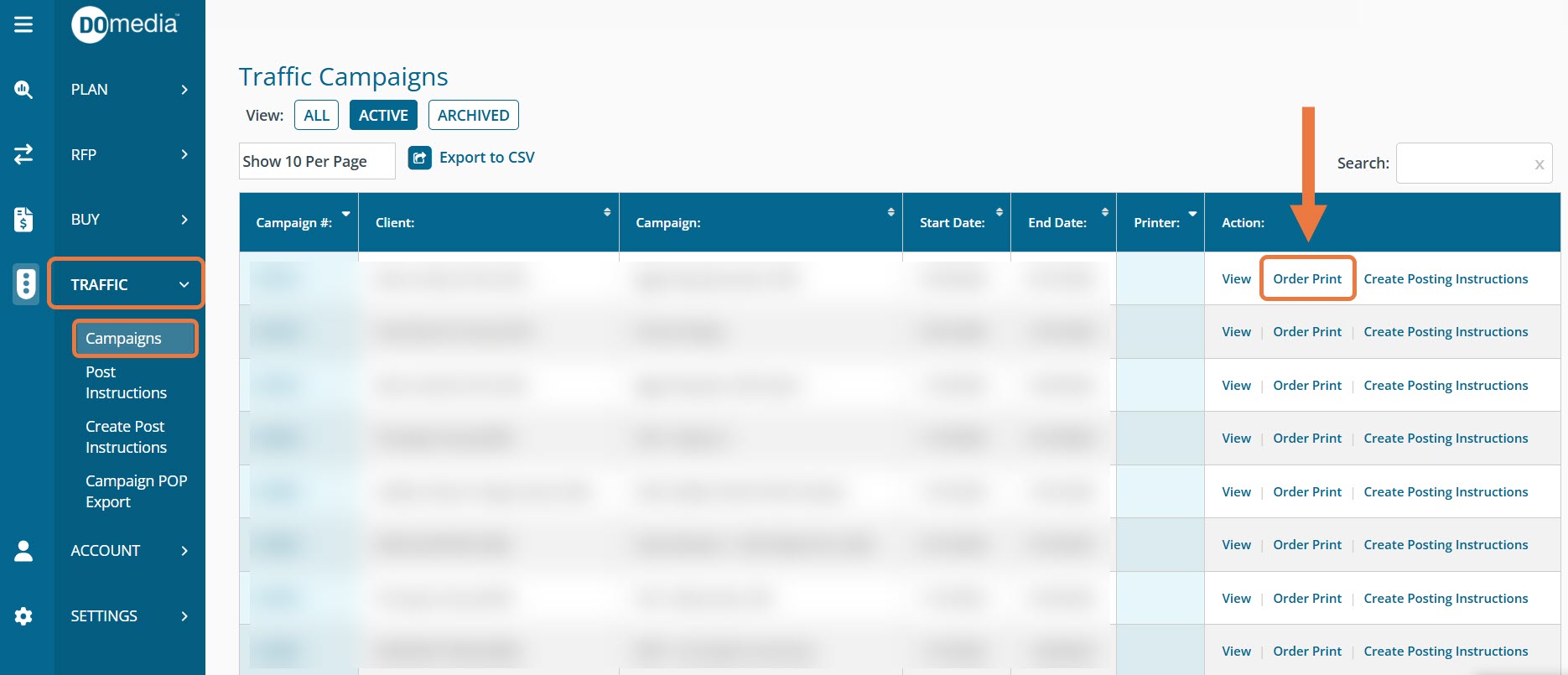 To create a new order, navigate to "Traffic" and select "Campaigns" on the left side menu. Locate the desired Campaign and click "Order Print" under the Action column.