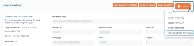 - The Issue Contract Internally option is only available when a contract is in Manager Approved status.