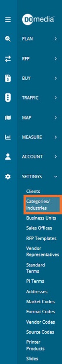 To create a category/industry, navigate to Settings and click on Categories/ Industries.