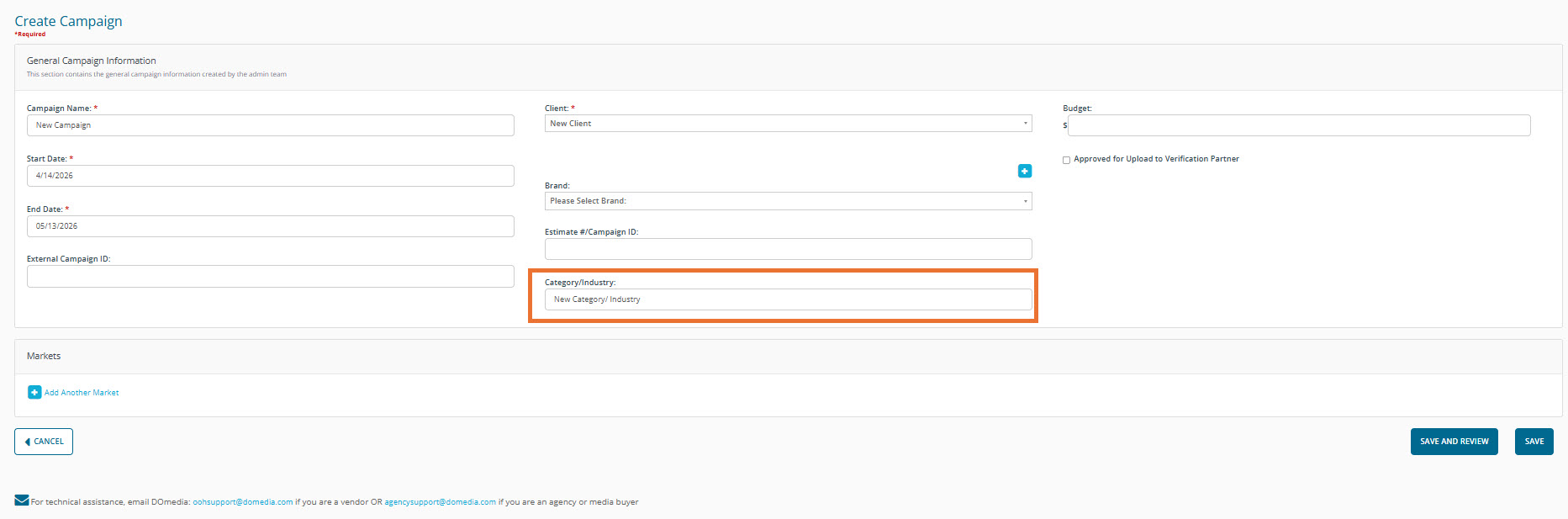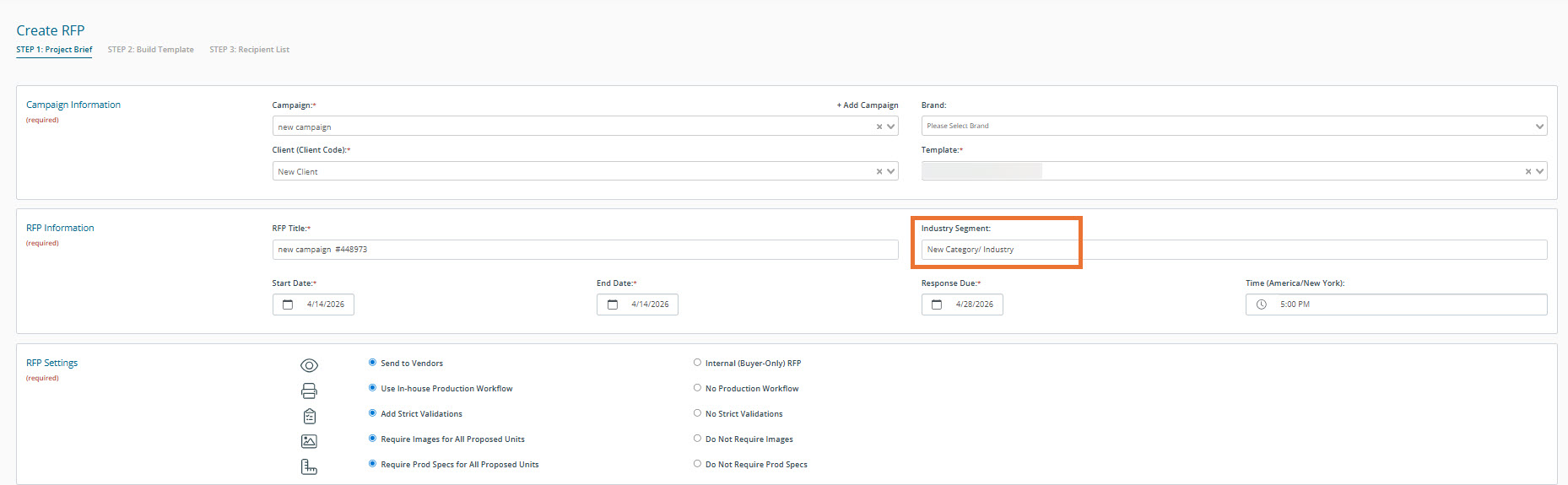 The Category/ Industry box remains editable on the campaign page, so any industry can be added or removed. Once an industry is added to a campaign, it will automatically pull into the RFP.