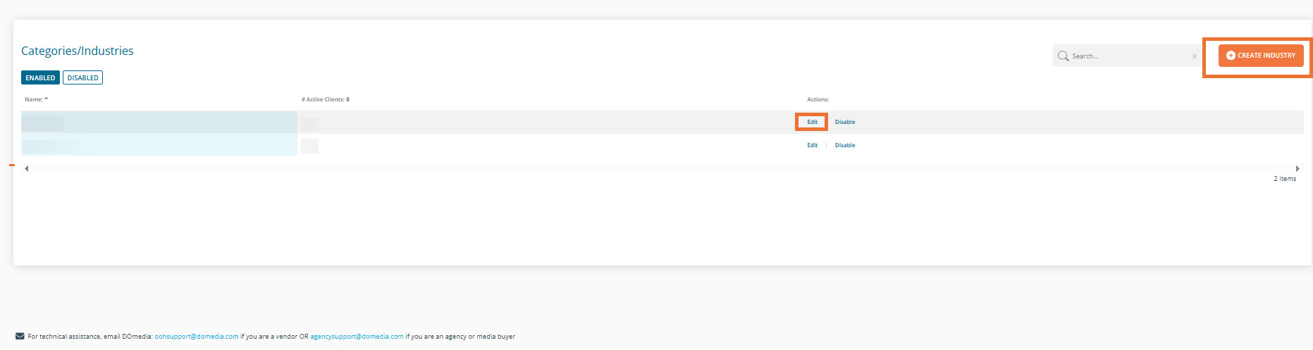 You'll be taken to the view page, where you can see all the previously made industries. From here, you can create a new category/ industry as well as edit or disable an old one.