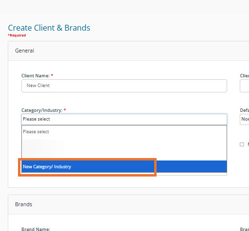 Once the Industry has been saved, you can add it to a client. Your Industry can be added when creating a new client or when editing an existing client. A drop list will show all of your enabled industries for you to choose from.