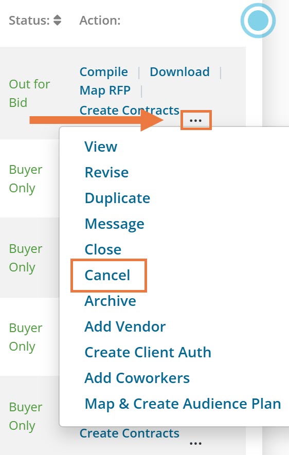 To cancel an RFP, simply click on the three dots and then "Cancel" under the Action column for the desired RFP in your RFP Dashboard.