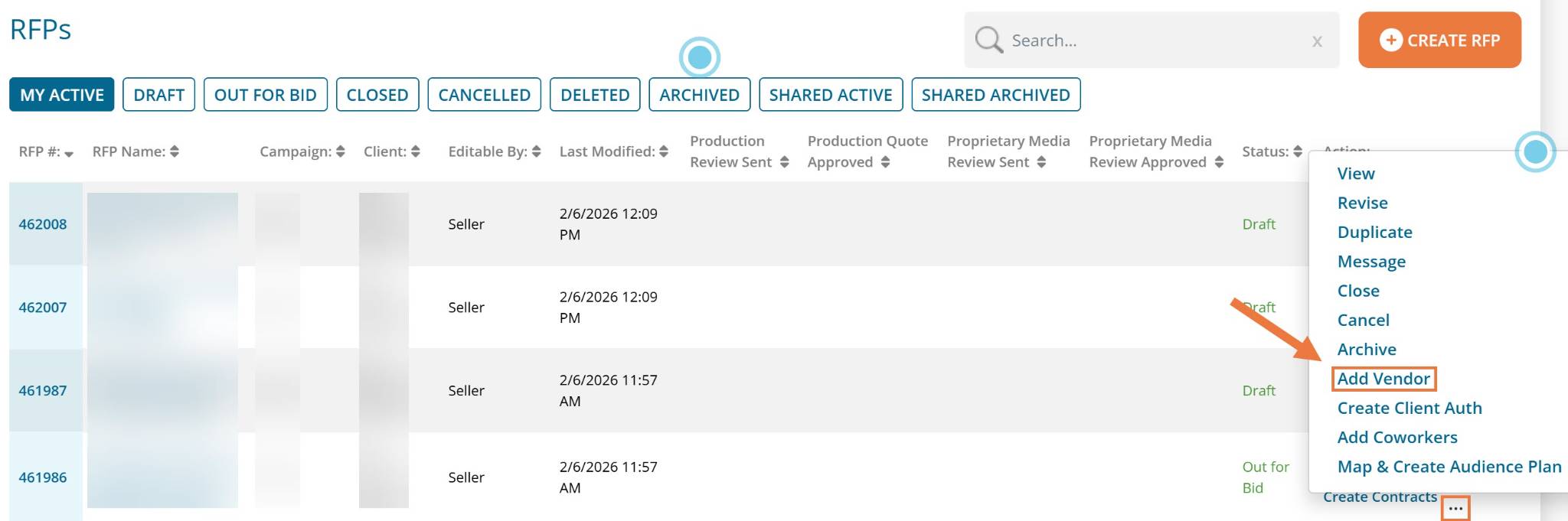 Find the desired RFP and click on ... under the Action column. Click "Add Vendor".