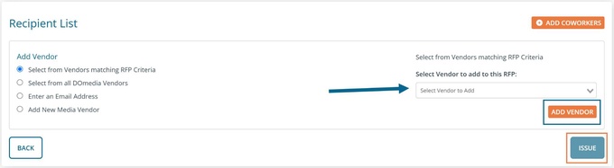 You will then be taken to the same screen as when you originally issued the RFP. From here you can search for the desired vendor and select your reps before Issuing.