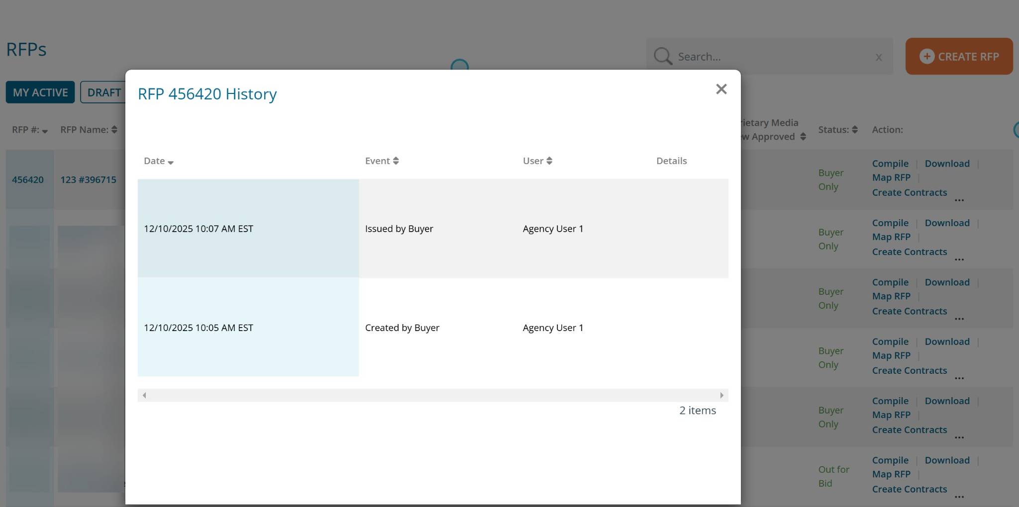 A box will pop up with the RFPs history.