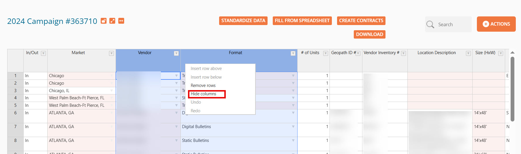 Right-click the column(s) you would like to hide. Select the columns around hidden columns to show them. You can hide/show multiple columns at a time by using your mouse to select multiple. Data within hidden columns will still be saved normally and all hidden columns are automatically unhidden on page refresh as well.