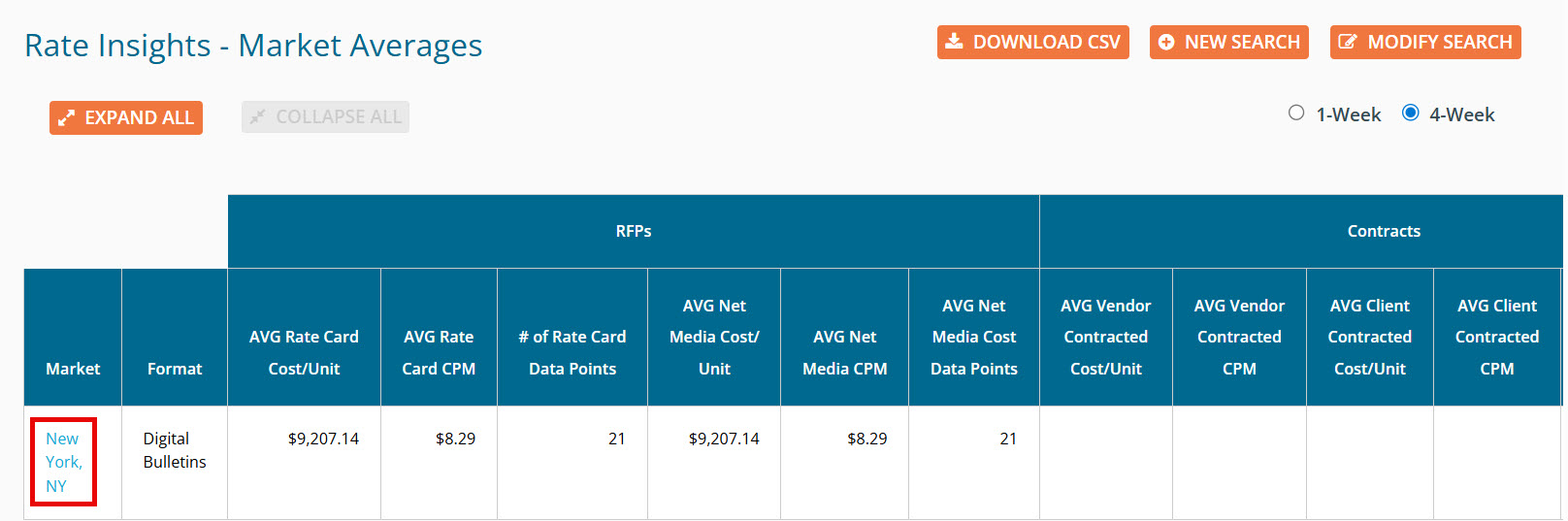 Rate Insights is a tool that will allow you to view market averages or historical data about specific units that you've previously contracted within DOmedia. You can utilize this functionality to help you make informed decisions when buying future OOH inventory.