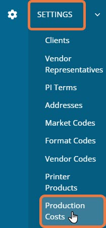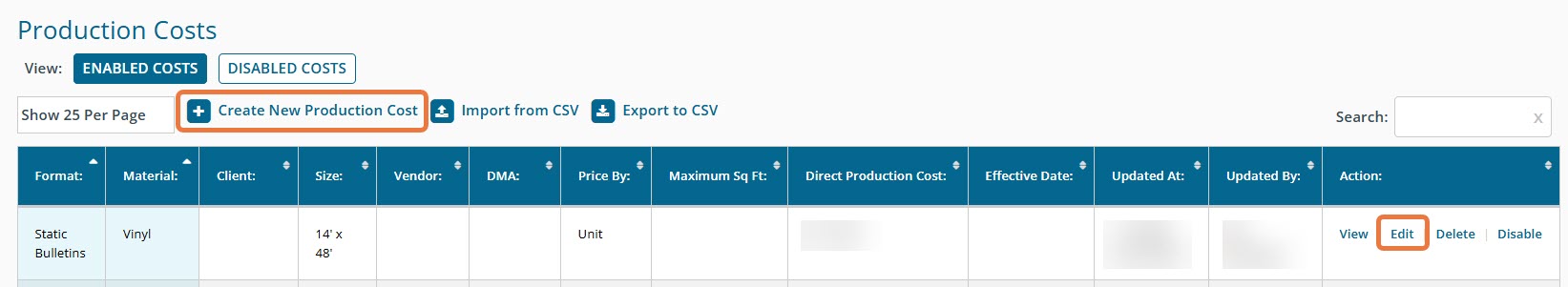 This page will list all of your existing Production Costs. You may "Edit" a current cost or select "Create New Production Cost."
