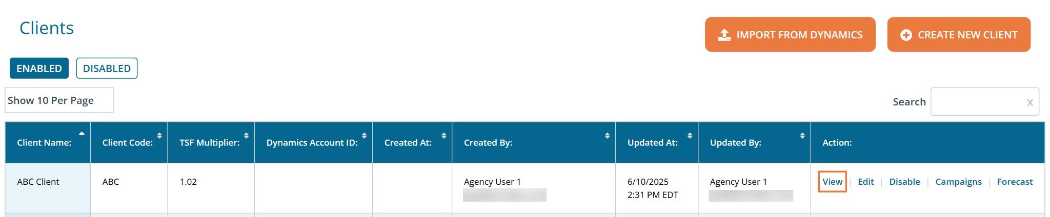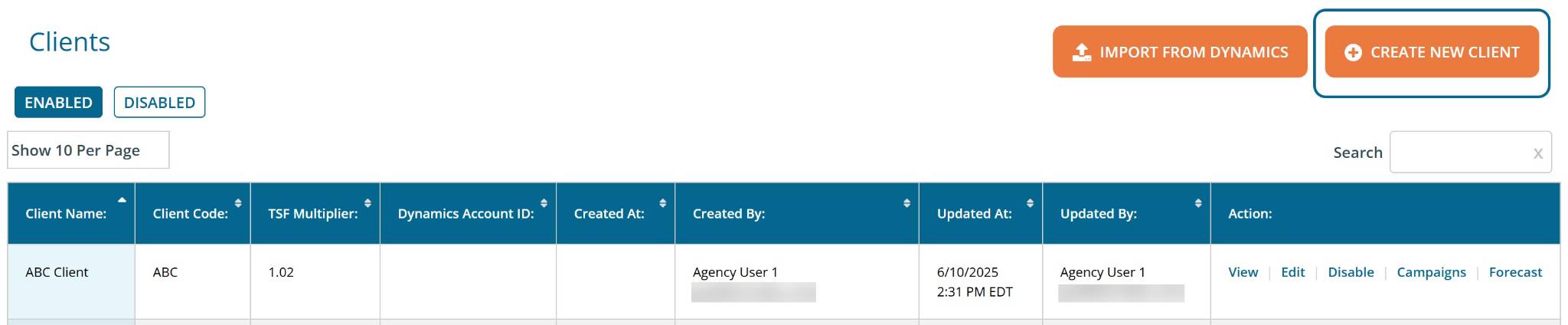Disabling Clients: To disable a client, select "Disable" on the right-hand side of the desired client. You can disable a client you are no longer working with to mark them as inactive in the system and to keep a record of their information.