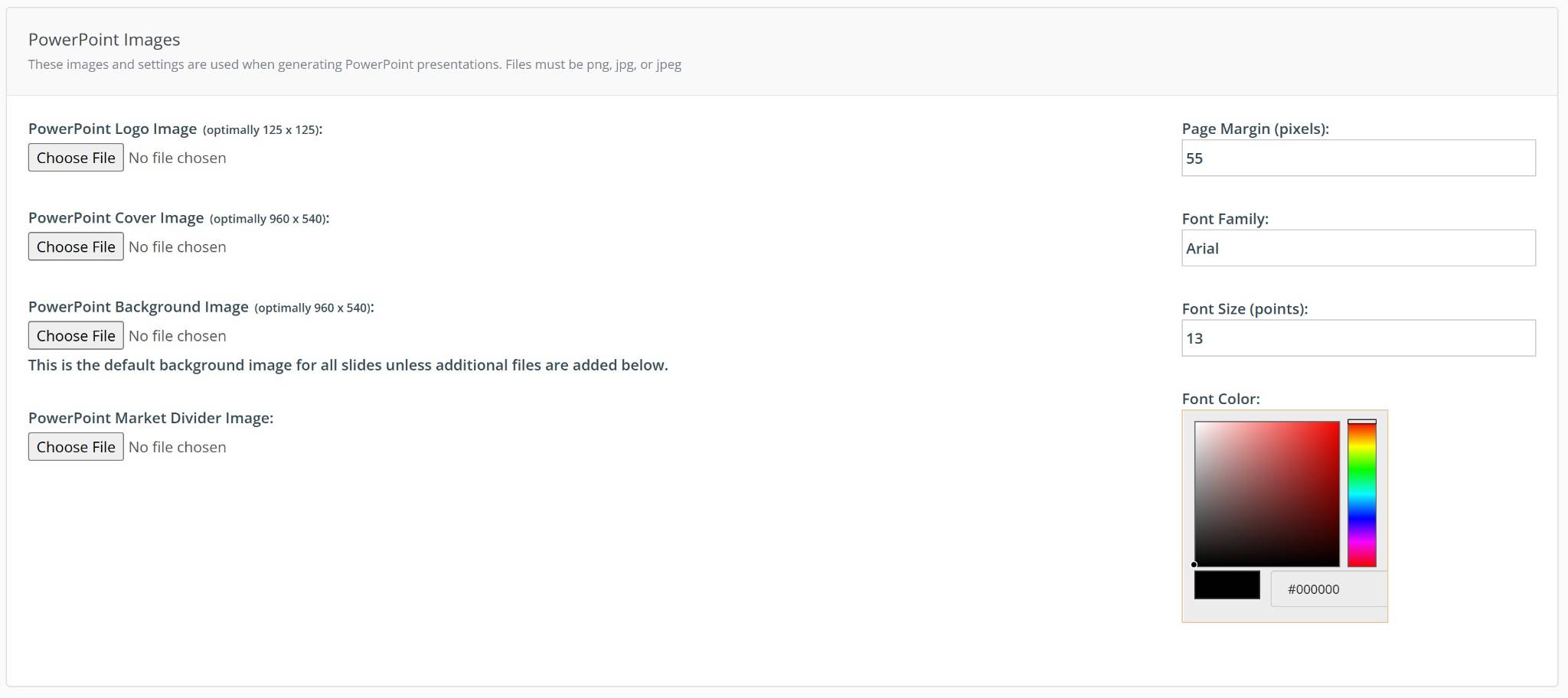 PowerPoint Options: Select logo, cover, background, and market divider image then click "save" when done.