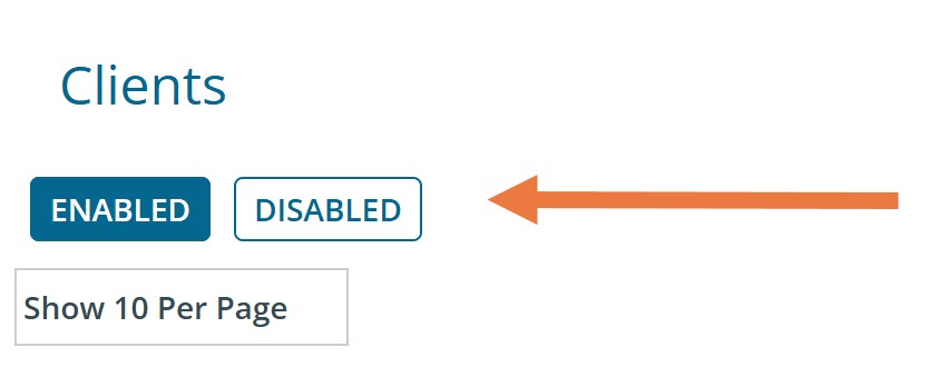 Any client that has been disabled will live in the Disabled Clients view and can be re-enabled at any time. To view all disabled clients: Click "Disabled" under View.