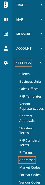 If you have an alternative address to a vendor's company address, you can add the address through Selling Company Address Management. To navigate to Selling Company Address Management, click on "Settings" then "Addresses" on the left-hand side menu.