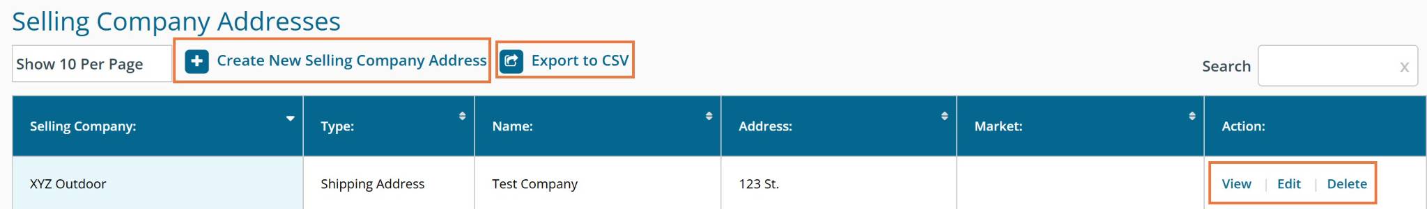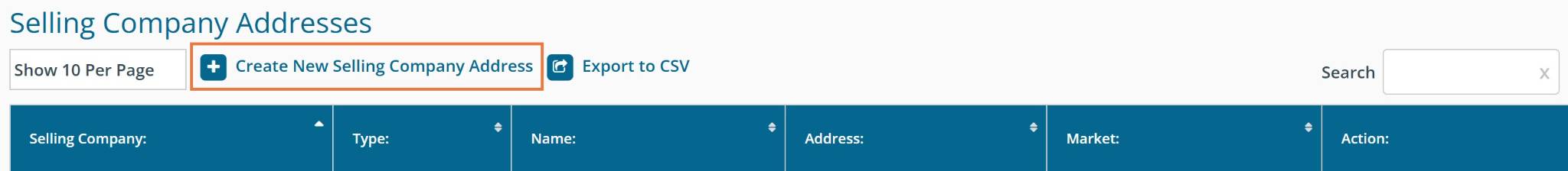 Export to CSV: Download the details presented in the Selling Company Address Management table as a CSV file that can be opened in Excel.