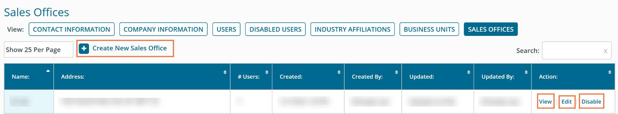 Here you will see your current Sales Offices, you can View, Edit, Disable, Delete, and Create New Sales Offices on this dashboard.