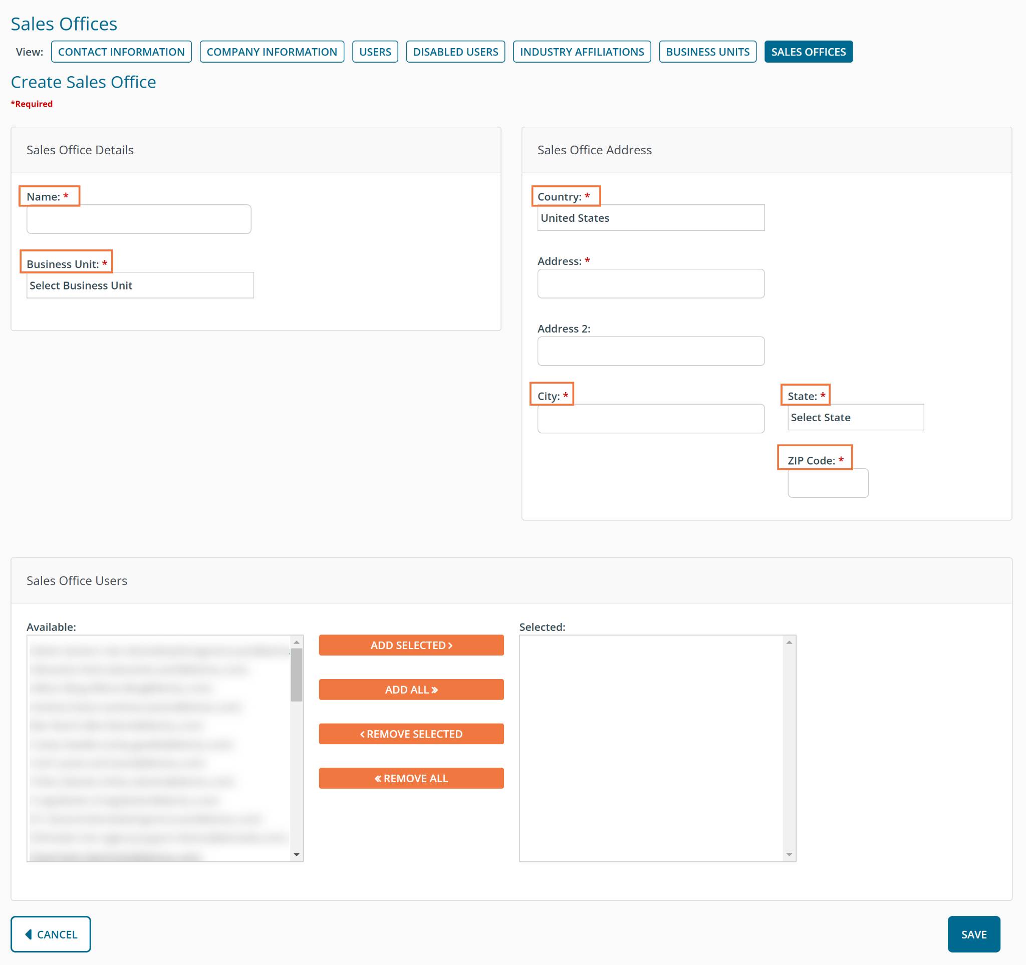 Fill out the Information to create your Sales Office. Items marked with an asterisk must be completed. Be sure to click save to save the Sales Office details.
