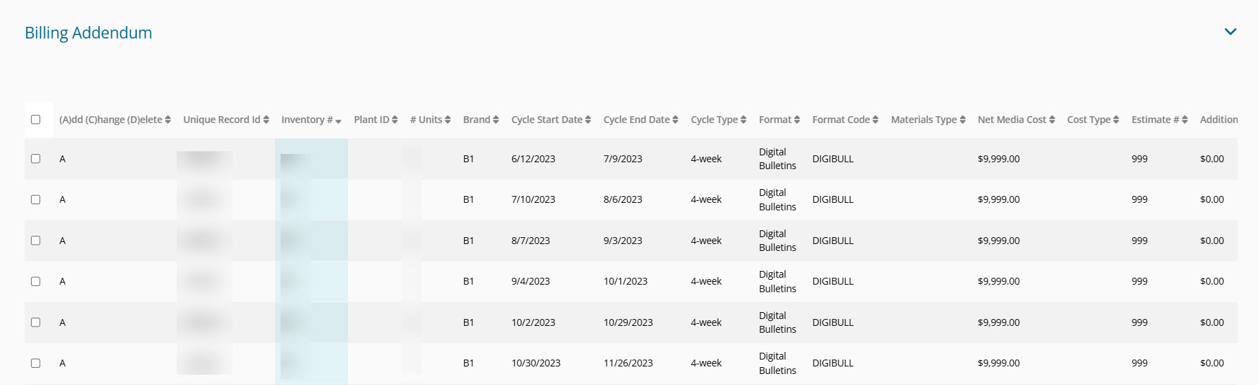 Once the contract has been created, you're able to see in the Inventory Information/Billing Addendum that the installation and production costs were made on their own line: